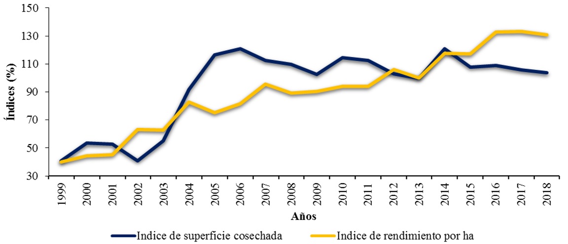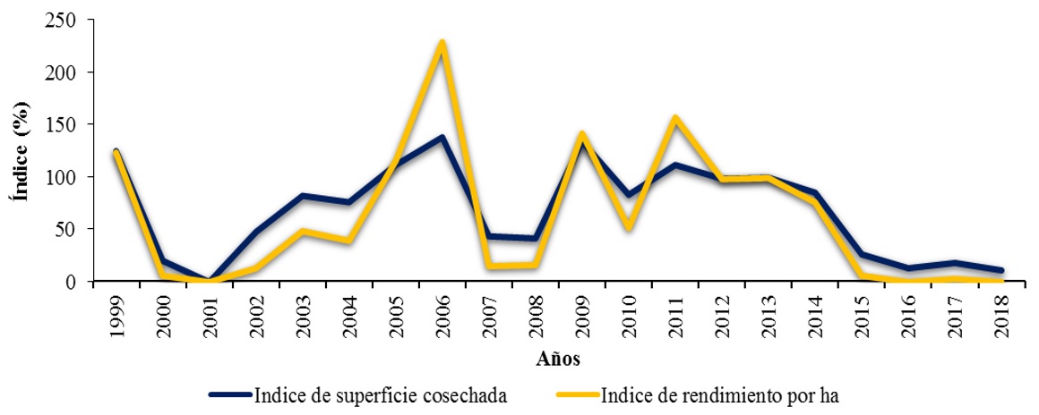 Al analizar los índices de superficie cosechada y rendimiento por hectárea, éstos presentan las mismas tendencias que en los otros indicadores para el año 2001 y el período de 2016 a 2018 (Figura 6).