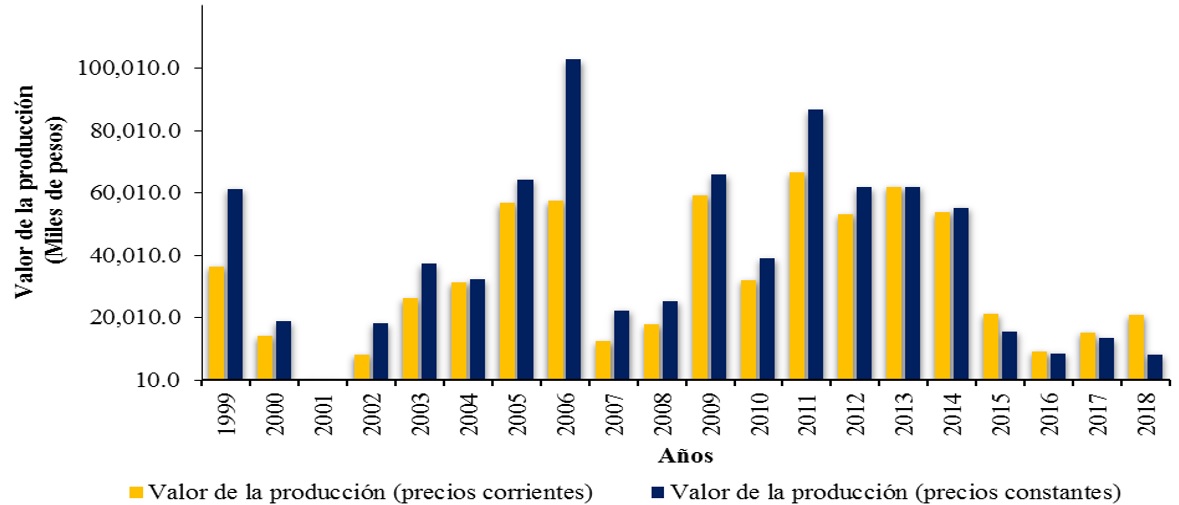Con respecto al valor de la producción tanto a precios corrientes como constantes, se observaron tres años que repuntan a lo largo del período de análisis. El primero de ellos fue 1999 (17,158 t), 2006 (28,726.2 t) y el 2011 (24,216.7 t), equivalente a $ 61,353.9 $ 102,719.5 y $ 86,594.5 miles de pesos a precios constantes, respectivamente (Figura 4).