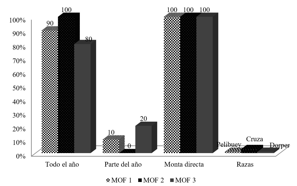 Estos programas no presentan un proyecto bien definido en su etapa reproductiva, como se muestra en la Figura 3, no hay monta controlada y el 100% se realiza todo el año como es el caso del MOF 2 (El Jagüey) en la comunidad de Maninalcingo; además, es directa y no controlada con respecto a la presencia de los estros o calores en cada módulo estudiado en las comunidades de Tehuaxtla y Maninalcingo en la Mixteca Poblana. Estos resultados son similares en un estudio realizado por Góngora et al. (2010), en el estado de Yucatán con unidades de producción ovina en cuanto al manejo reproductivo; donde, el 23% de estas unidades utiliza al semental solo parte del año.