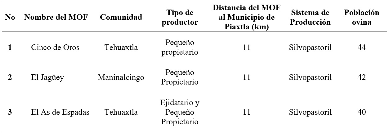 La información general del sistema de producción se observa en Cuadro 2, dos productores corresponden a la comunidad de Tehuaxtla y 1 a la comunidad de Maninalcingo; estos MOF, se encuentran a una distancia promedio de 11 km del municipio de Piaxtla, Puebla.