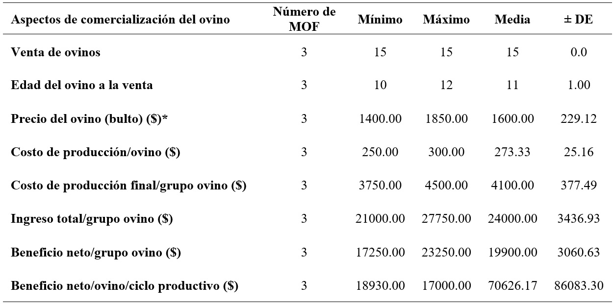 Por el lado del mercadeo y la comercialización, estos ovinos que se producen en ambiente silvopastoril de esta región Mixteca, es completamente local y se venden a pie y no por peso. Incluso esta venta o comercialización, se puede dar por edad del ovino (10 a 12 meses), indicador encontrado por Hernández (2006) y Sánchez (2006), al establecer que es una edad sumamente importante por el comprador; debido, a la jugosidad, palatabilidad y preferencia de la carne en estos pequeños rumiantes (ovinos y caprinos). En relación a costos de producción y rentabilidad de estos ovinos, se encontró que las condiciones silvopastoriles, sobre todo en la alimentación (arbóreo-arbustiva) y del pasto natural, es muy favorable para cada productor de los MOF en esa región de la Mixteca Poblana; como se observa en el Cuadro (3), el importante beneficio neto/ovino/ciclo productivo; donde la mano de obra familiar en la región Mixteca de Puebla, es por los propios integrantes de la familia (madre, hijos y parientes cercanos), disminuyen el costo de producción de este pequeño rumiante al productor familiar Mixteco (Ibarra, 2002).