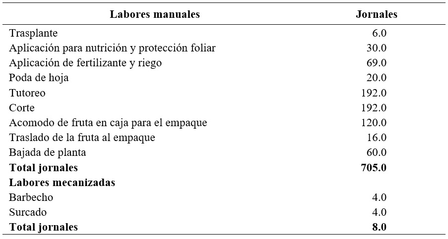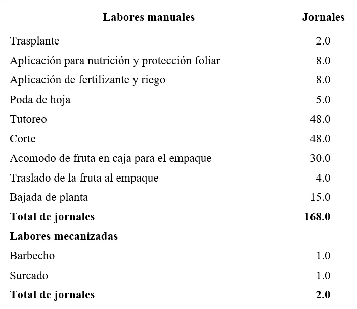 Por lo que es de trascendencia resaltar que hay actividades que se desarrollan en el proceso de producción de la hortaliza que son fuertemente demandante de mano de obra como es el tutoreo y el corte que estas dos tareas ocupan 384 jornales, el cual le generaron un gasto a la unidad de económica de $76,800 pesos en el ciclo productivo, el acomodo de la fruta para el empaque generó un gasto de $24,000.00 pesos, la aplicación de fertilizantes y riego fue de $13,800.00 pesos, entre los más sobresalientes.