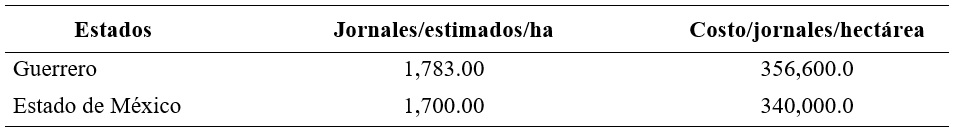 El sector primario en México debido a la diversidad de cultivos y a la falta de innovación tecnológica demanda muchos jornales para realizar las actividades del campo, para el caso de los estados analizados la demanda mano de obra no es la excepción, como se puede ver, el número de jornales estimados por hectárea para la entidad federativa de Guerrero fue de 1,783.0 y para el Estado de México 1,700.0 jornales, lo que muestra la relevancia en el uso de este factor de la producción en el pepino persa en invernadero, finalmente el gasto que se realizaría para una hectárea en el estado de Guerrero sería de $356,600.0 y para el Estado de México $340,000.0 pesos respectivamente, una derrama económica muy fuerte para los productores de pepino persa en condiciones de invernadero, a pesar de la demanda laboral, la disponibilidad de mano de obra llega a escasear en estos estados (Cuadro 6).