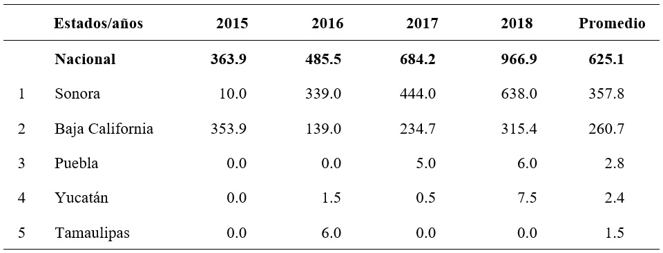 De acuerdo con la información que se presenta en el Cuadro 1, revela que la actividad productiva del pepino persa en México es relativamente nueva, ya que en México a partir de 2015 el gobierno federal empezó a generar las estadísticas para la hortaliza en donde se observó que solamente se produjeron 363.9 hectáreas en donde participó Baja California con el 97.3% de la superficie cosechada, en donde prácticamente se mantenido la superficie cosechada ya que para 2018 fueron 315.4 hectáreas. Sin embargo, Sonora si tuvo un dinamismo en este rubro al presentar una tasa de crecimiento de 99.9%, lo cual es resultado de tener una superficie en 10 hectáreas en 2015 a 638 hectáreas en 2018.