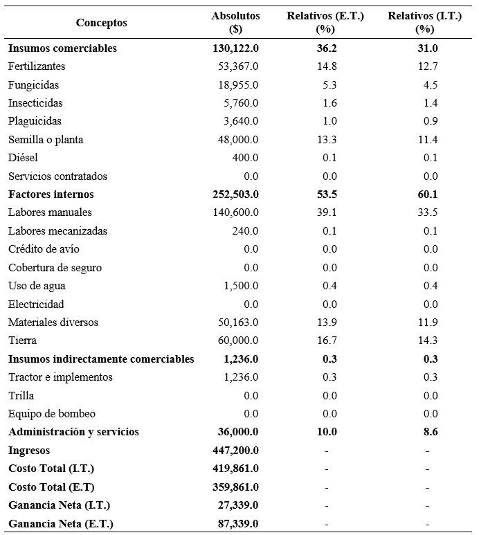 El análisis se dividió en cuatro categorías, siendo insumos comerciales, factores internos, insumos indirectamente comerciables y administración y servicios. En este sentido, la unidad producción obtuvo ingresos de $447,200.0 pesos y los costos de producción cuando se consideró el costo de la tierra significó el 93.9% y las ganancias netas fueron de 6.1% del ingreso de la unidad de producción, cuando el concepto de tierra fue excluido los costos representaron el 80.5% y las ganancias netas el 19.5%, lo cual deja claro que a pesar de las condiciones de clima que afectan a la producción, es rentable la producción de pepino persa.