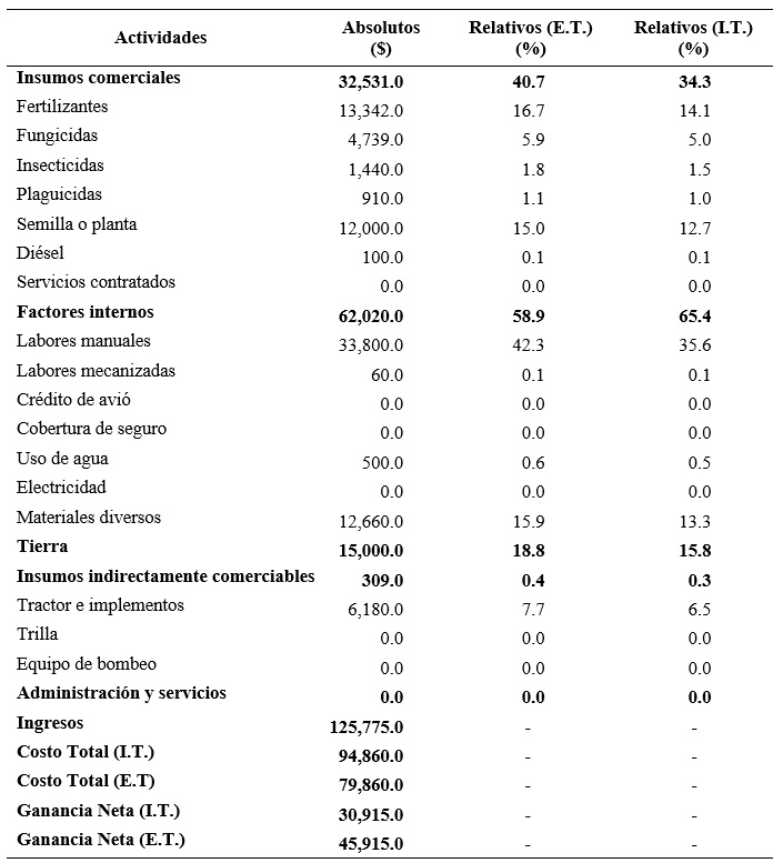 Esta metodología está integrada de cuatros componentes principales, que es como se desagregó en la matriz de coeficientes técnicos los cuales son: 1) Insumos comerciables, dentro de los cuales se contabiliza los fertilizantes, herbicidas, insecticidas, semilla o planta, entre otros, 2) Los factores internos o factores de la producción, en este se registra las labores manuales, las mecanizadas, materiales diversos, tierra, entre otros, 3) Insumos indirectamente comerciables, en donde se considera el tractor e implementos y 4) Administración y servicios que se requiere para facilitación del proceso de producción.