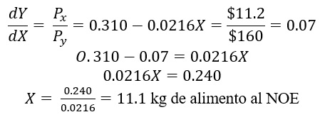 La operación matemática para generar el valor del nivel óptimo económico (NOE), consistió en igualar el PMg a la relación de precios del insumo y del producto; al cociente del precio del alimento (Px) y el precio del conejo in vivo (Py), como sigue (Rebollar et al., 2014; Rebollar et al., 2016; Rodríguez et al., 2017):