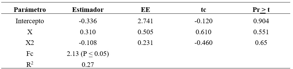 Con base en los resultados, en general, el modelo es estadísticamente significativo en términos del valor de la Fc, pese a que el valor de este estadístico apenas superó la barrera del valor de la Fc de 2.0 (Gujarati y Porter, 2010). De forma individual, el modelo no fue significativo estadísticamente, por lo que es lógico pensar que la no inclusión de otras variables biológicas con influencia en el PVF (variable dependiente) pudieron haber incrementado su significancia, pero ese no fue tal propósito; sin embargo, con base en la teoría microeconómica, el modelo presentó lógica económica y, por ende, significancia económica debido a que el signo de la variable X. fue el esperado; negativo, lo que permitió dar la concavidad de la curva de la función de producción (Nicholson y Snyder, 2015) y en efecto, su respectiva optimización (NOT y NOE).