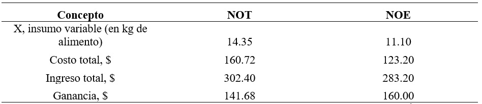 La ganancia, en dinero, el NOE, se obtuvo como G = IT – CT. Por lo que el IT = (Py)(Y) = $160 (1.77 kg) = $283.20 y, el valor del CT = (Px) (X) = ($11.2) (11.1 kg) = $123.20. Por tanto, la ganancia estimada al NOE es: G = $283.20 - $123.20 = $160.00 (Cuadro 4).