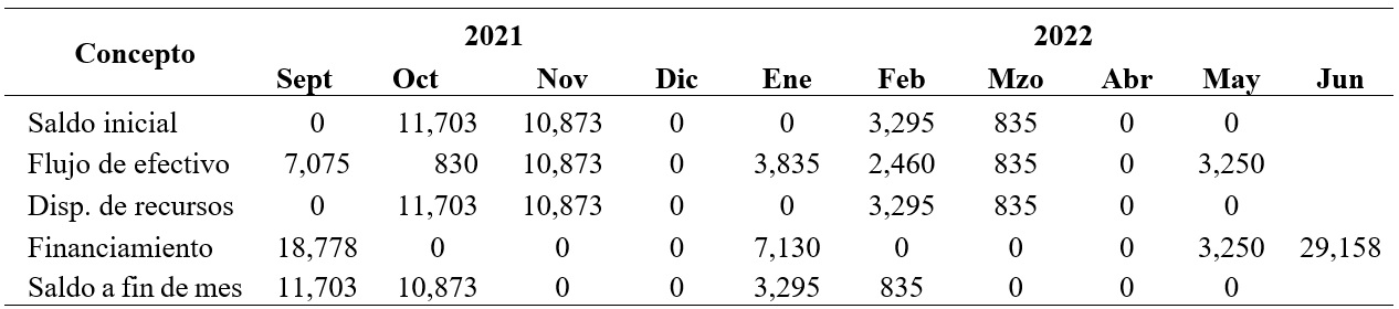Para efectos de la determinación del flujo de efectivo, se toman las cantidades calculadas consideradas como gastos directos al final de cada mes en lo particular, mismas cantidades que se utilizan para el cálculo del capital de trabajo (Cuadro 4).