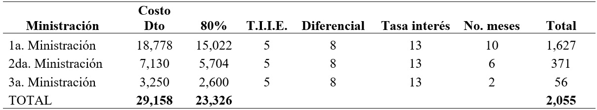 Costo financiero: Se realiza el cálculo de intereses para cada una de las ministraciones utilizando la fórmula universal (Díaz y Aguilera, 2013) que es: