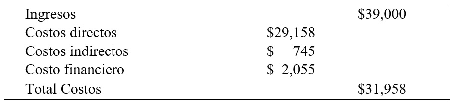 De la Relación Beneficio-Costo: Se obtiene de dividir el total de los ingresos obtenidos entre los egresos realizados dentro del mismo período de tiempo, por lo que al realizar esta operación se observa que el total de las ventas totales es de $9,000 y los egresos generados por costos directos son $29,158, costos indirectos por $745 y costo financiero por $2,055 para dar un total de $31,958
