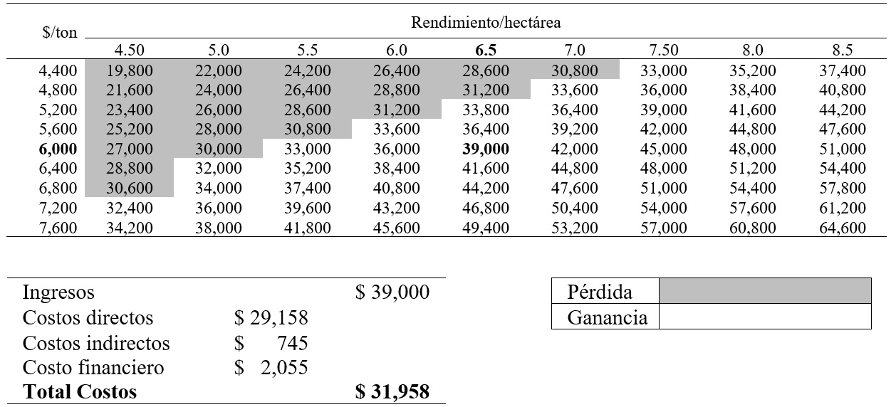 Como se observa, con la producción de 5.33 toneladas por hectárea, el productor puede cubrir los costos directos, indirectos y el pago de los intereses generados por el financiamiento mientras que solo para el pago de los costos directos se requieren 4.86 ton/ha.