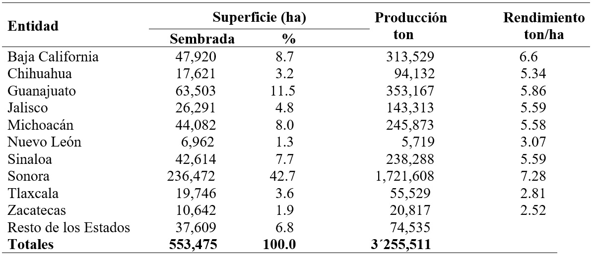 El trigo se destina para uso forrajero, consumo humano, semilla y elaboración de productos industriales como pastas, galletas, sopas, entre otras, así como en la elaboración de alimentos para consumo animal. De acuerdo con el USDA, este cereal es considerado el segundo más importante en la dieta de los mexicanos, ocupa el sexto lugar por superficie cosechada y por volumen de producción está entre los principales cultivos anuales y perennes en México (USDA-FAS, 2021). A nivel nacional tiene una gran importancia, sobre todo en el noroeste del país donde se concentra la mayor producción la cual se vende a mercados locales e industrias procesadoras siendo los estados de Sonora, Guanajuato, Sinaloa, Baja California, Michoacán y Jalisco los primeros seis productores; en siguiente Cuadro de muestra su comportamiento (www.gcma.com.mx/mercado-del-trigo)