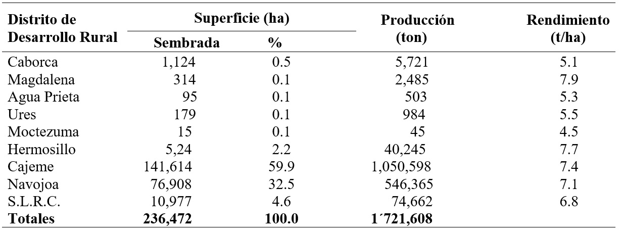 En Sonora se tuvo en ciclo otoño invierno 2021-2022 se tiene una siembra de 236,472 hectáreas con una producción estimada de 1´721,608 toneladas en los Distritos de Desarrollo Rural en donde se sembró el trigo donde sobresale el DDR Cajeme con el 59.9 % seguido de Navojoa con el 32.5%, en ambos distritos predomina la siembra con sistemas de riego por gravedad.