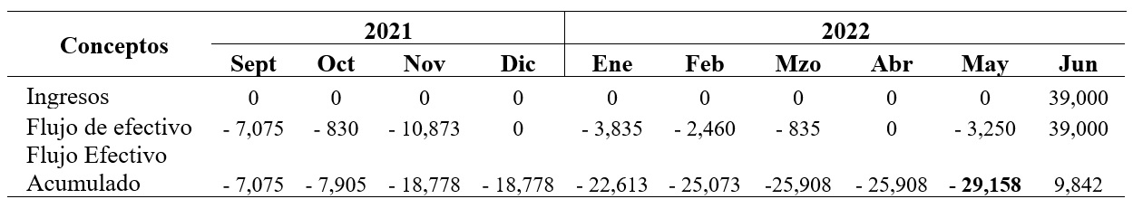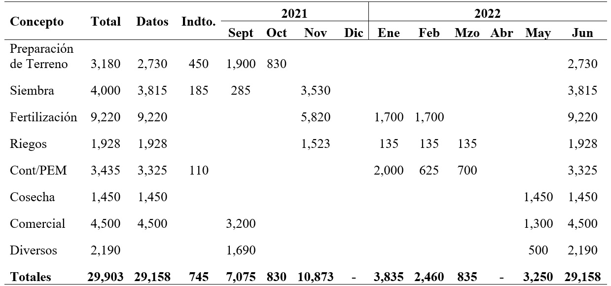 Para efectos de determinar el flujo de efectivo del cultivo en función de la época de desarrollo, se toma como referencia un precio de venta estimado para el mes de junio de 2022 por $6,000 con un rendimiento promedio de 6.5 ton/ha lo cual arroja un ingreso bruto de $39,000.