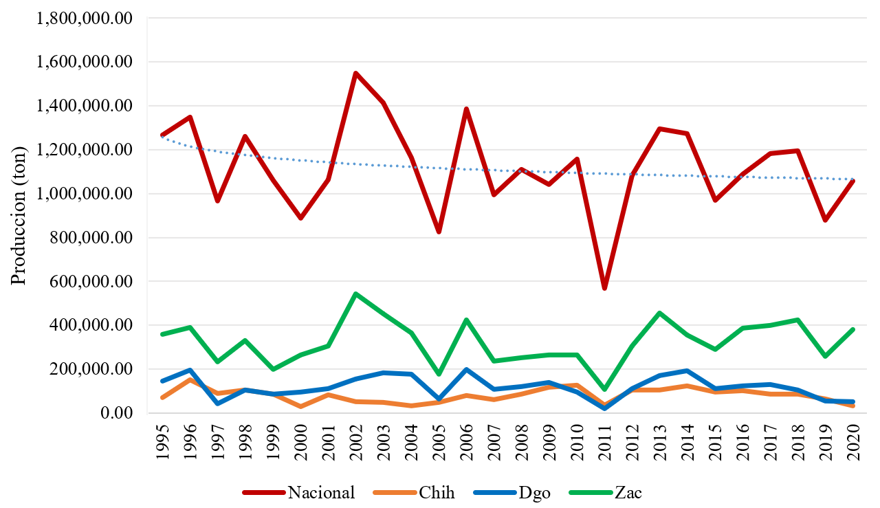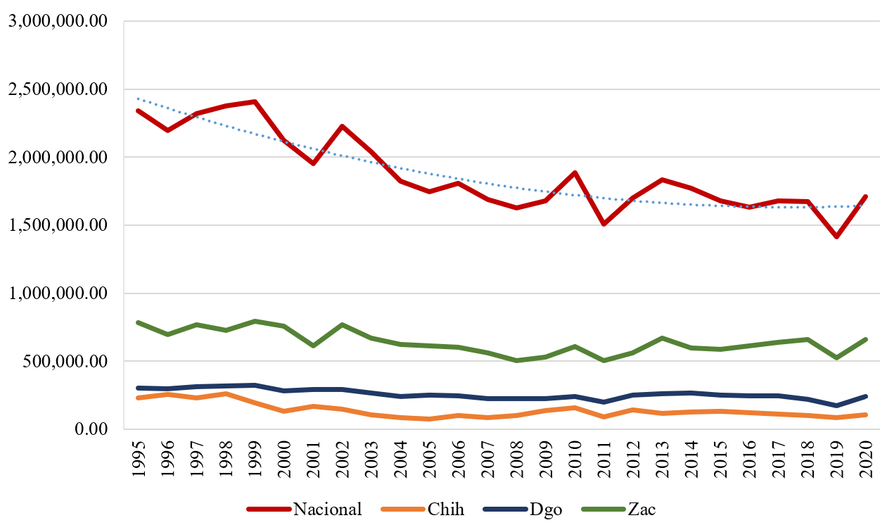 La situación que se presenta con la producción de este alimento básico es muy similar a la de la superficie sembrada de frijol ya que la caída es de 212,184.39 toneladas entre el año de 1995 con respecto al de 2020 y que representó una pérdida de producción del 16.73%. La mayor producción de frijol se logró en el año de 2002 con 1.55 millones de toneladas y la menor se reportó en el año de 2011 con 0.57 millones de toneladas. A nivel estatal, los estados de Chihuahua y Durango tuvieron drásticas reducciones en la producción de esta gramínea del orden del -53.27% y - 65.23% respectivamente, en tanto que Zacatecas tuvo un repunte ligero en la producción del 6.07%. La evolución en la drástica caída de producción del frijol a nivel nacional y en las entidades que se consideraron en el estudio se muestran en la Figura 2.
