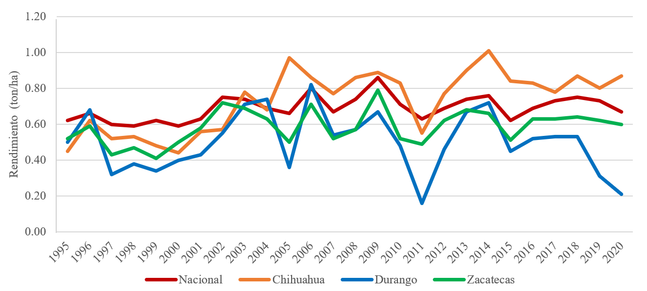 En el Cuadro anterior se observa un estancamiento a nivel nacional de los rendimientos medios por hectárea, razón por la se puede establecer el supuesto que nivel de productor no han llegado las diferentes tecnologías agrícolas que impulsan la productividad de este alimento básico, solo por excepción en el año 2014 y en el estado de Chihuahua se rebasó la tonelada y que marcó el máximo rendimiento y por otro lado en el año 2020, los rendimientos de campo fueron raquíticos, ya que apenas rebasó los 200 kilogramos.