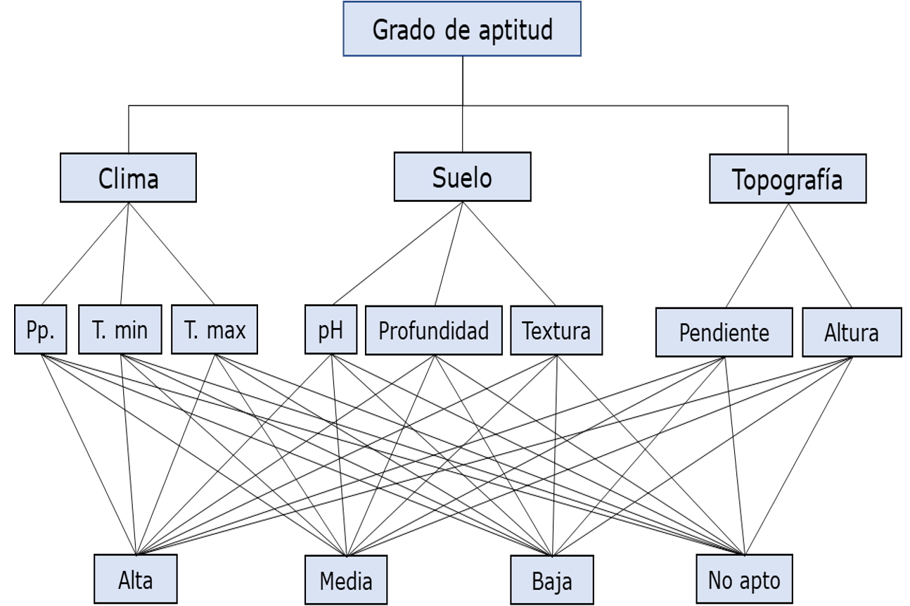 Las técnicas de evaluación multicriterio (EMC) para generar los niveles de aptitud para el cultivo del frijol corresponden a la conjunción del AHP y la combinación lineal ponderada (WLC), cuyos criterios continuos (factores) se estandarizan en un intervalo numérico común, y enseguida se combinan por medio de un promedio ponderado. La estructura jerárquica de los criterios y subcriterios utilizados se muestra en la Figura 4.
