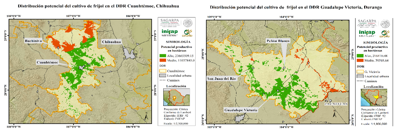De acuerdo con Medina-García et al. (2016), señala que en México el frijol es el segundo cultivo en importancia después del maíz ya que, se siembra en 1 590 876 hectáreas en el país y de las cuales el 85% se siembra bajo condiciones de temporal y diversos sistemas de producción. Por su parte el INIFAP (2017), desarrolló el proyecto de actualización de sus agendas técnicas agrícolas (una por cada estado de la república) y las referencias de potencial productivo se tomaron de esos documentos de Chihuahua, Durango y Zacatecas.