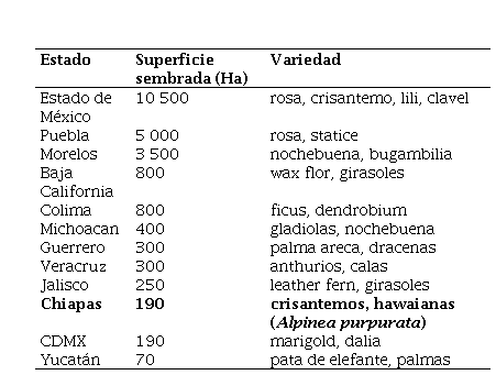 En el webinar: Tapping into Mexico's ornamental horticulture industry, Santiago Argüello Campos, director general de fomento a la agricultura de coordinador de la SADER (Cuadro 1), menciona los principales estados con mayor producción de flores, donde se puede observar en la décima posición al estado de Chiapas, con 190 héctareas registradas como cultivadas con dos variedades de flores: crisantemos y hawaianas (FloraCulture International, 2021).