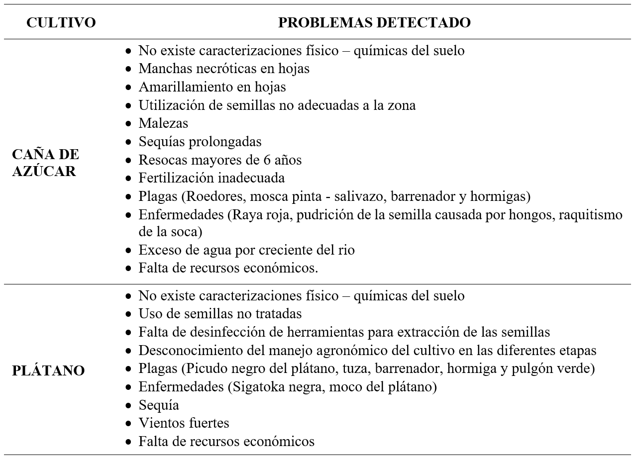 Se observó que, en los cultivos en la etapa de desarrollo vegetativo, presentan diferentes problemas fitosanitarios, como por ejemplo el picudo negro (Cosmopolites sordidus), y la Sigatoka negra (Mycosphaerella fijiensis), que representan el principal factor en la baja producción de la planta, en estos dos casos, el 100% de los encuestados dijo en que sus plantíos tienen presencia de estas enfermedades.
