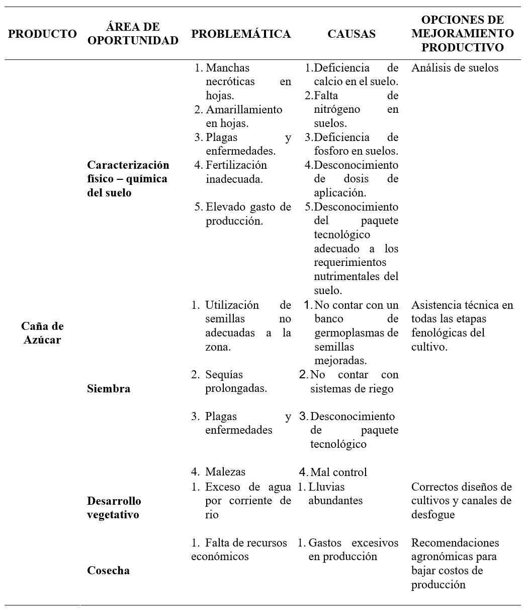 En las Cuadro 2, 3 y 4 se muestran áreas de oportunidad que detecto el Instituto Tecnológico Superior de Cosamaloapan, durante las visitas a campo y a través de la aplicación de encuestas a productores, agrupados por el cultivo que realizan, así mismo, las opciones de mejoramiento productivo que se reconocen.