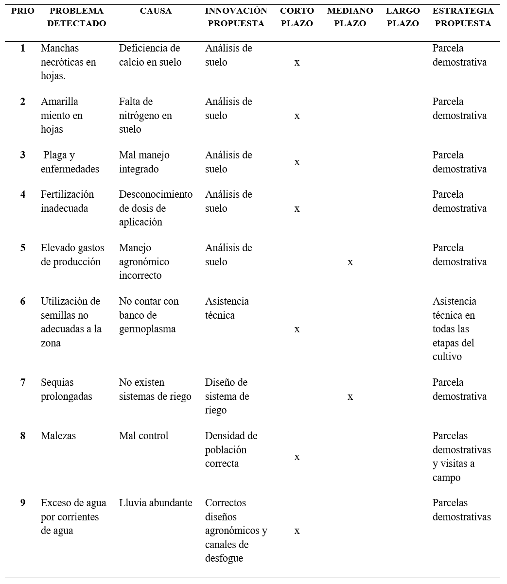 Según datos proporcionados por los productores, identifican los problemas que se padecen durante todas las etapas fenológicas del cultivo y que afectan su rendimiento. Algunos problemas si son combatidos a tiempo, pueden ser controlados, en caso contrario, han llegado a afectar en su totalidad la producción. Los problemas detectados sistema producto se muestran en la Cuadro 1.