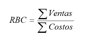 Relación Beneficio-Costo (RBC). Es aquella relación en que tanto el flujo de las ventas o beneficios como el de los costos de operación se actualizan a una tasa de interés que se considera próxima al costo de oportunidad del capital; en este caso no se utiliza ningún factor de actualización por ser un cultivo que se siembra, desarrolla y termina en un periodo de 9 meses. Para llevar a cabo la revisión de este indicador se utilizará la siguiente fórmula: