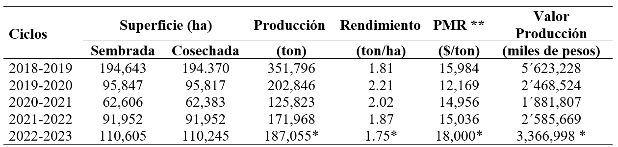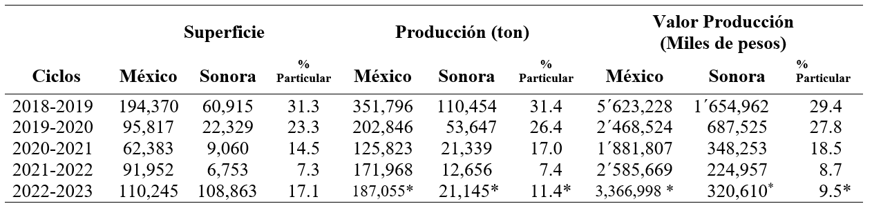 Para el estado de Sonora y de acuerdo a los valores que se muestran en el Cuadro 3, en el ciclo 2018-2019 se cosecharon 60,915 hectáreas con un volumen de 110,454 toneladas y un valor de producción por 1´654,962 miles de pesos mientras que el ciclo 2022-2023 se sembraron 10,863 hectáreas con una producción estimada de 21,145 toneladas, un rendimiento promedio de 2.5 ton/ha y un valor 320,610 miles de pesos; en el Cuadro 3 se muestran los ciclos intermedios siendo el 2021-2022 el cual muestra los valores más bajos en cuanto a superficie cosechada, volumen de producción y valor de la producción.