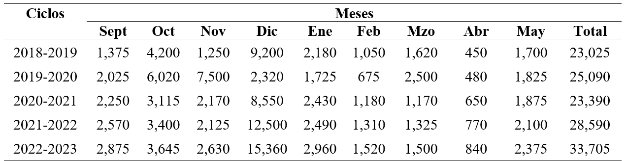 El comportamiento del garbanzo en el ciclo 2018-2019 fue del orden de las 194,370 hectáreas cosechadas con un volumen de las 351,796 toneladas con un valor de producción de 5´623,228 miles de pesos mientras que en el ciclo 2022-2023 se cosecharon 110,245 ha con una producción de 187,9565 toneladas y 3´336,998 miles de pesos (valor estimado) tomando como referencia la cantidad de 18,000 por tonelada producida y vendida; estos valores al igual que los ciclos intermedios entre los mencionados arriba se muestran en el Cuadro 2.