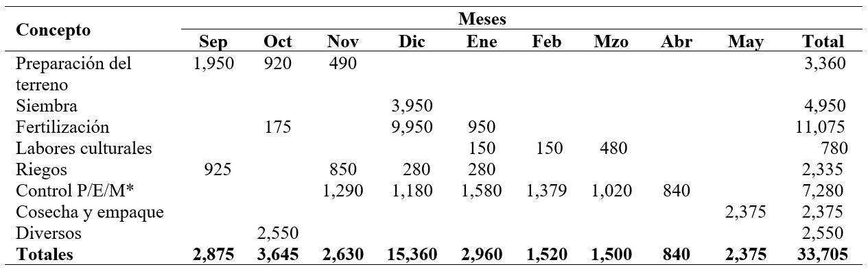 En este sentido y por tratarse de un cultivo que requiere un manejo empresarial para poder hacerlo rentable, se recomiendan tres ministraciones en donde la primera se otorga en el mes de septiembre al inicio del ciclo productivo, la segunda en diciembre y la tercera en marzo del siguiente año; en todos los casos se calculará sobre la base del 80 % de los costos directos por ser una práctica común que se lleva a cabo en cualquier institución financiera; el otro 20 % de los costos los aportará el productor con recursos propios el cual no causa costo financiero (Díaz y Aguilera, 2013)