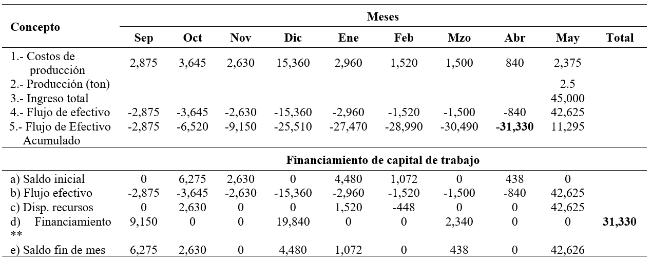 De acuerdo con los resultados mostrados en el cuadro anterior, el capital de trabajo es por la cantidad de $31,330 pesos por hectárea que se observa en la suma del financiamiento la cual coincide con el saldo negativo más alto del flujo de efectivo acumulado.