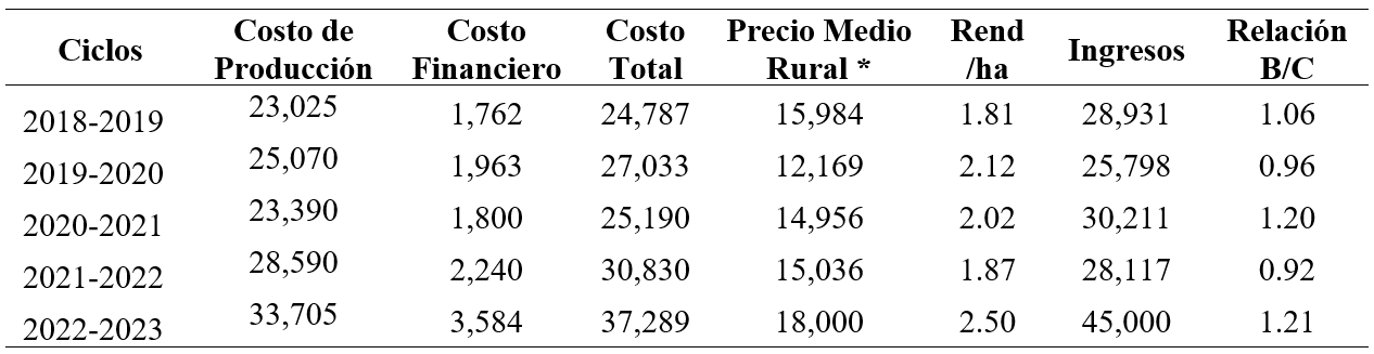El comportamiento de este indicador a través de los diferentes ciclos muestra un desarrollo que va desde el 1.06 en el ciclo 2018-2019 de 1.21 hasta el ciclo 2022-2023. Esto significa que por cada peso que el productor invierte, recupera 6 centavos para el primero de los ciclos y de 21 centavos en este último ciclo agrícola; en el Cuadro 9, se observan estas cantidades haciendo notar que en los ciclos 2019-2020 y 2021-2022 esta RB/C fue de 0.96 y 0.92 respectivamente lo cual da como resultado una pérdida para el productor.