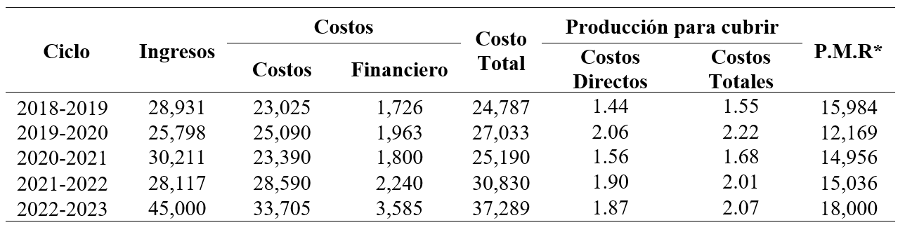 Por lo que se refiere al ciclo 2022-2023 se requerían 1.87 toneladas para cubrir los costos de operación y de 2.07 toneladas para los costos totales, en Cuadro 11 se observan estos resultados.