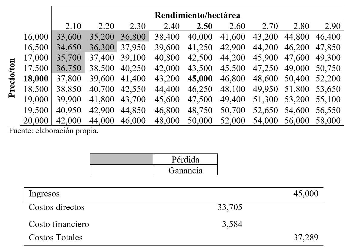 En este caso, y solo como ejemplo, para el ciclo 2022-2023 se mantuvo fija la cantidad de $18,000 por toneladas con un rendimiento promedio de 2.5 ton/ha lo cual da como resultado la cantidad de $45,000 como ingreso por hectárea mientras que las posibles combinaciones de rendimiento por hectárea y el precio por tonelada arrojan cantidades diferentes buscando de esta manera un escenario pésimo donde el productor obtenga pérdidas mientras que el óptimo obtiene los mejores ingresos. En el Cuadro 12 se muestran estos escenarios, así como las áreas sombreadas en las cuales le productor incurre en pérdidas.