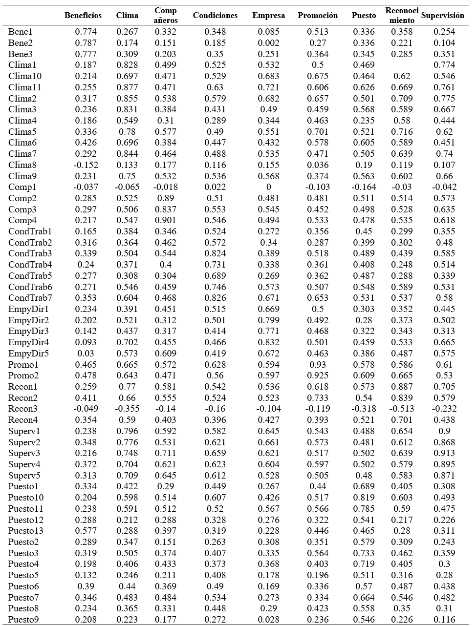 Palabras clave: Clima organizacional, beneficios, compañeros, condiciones, promoción, puesto, reconocimiento, supervisión.