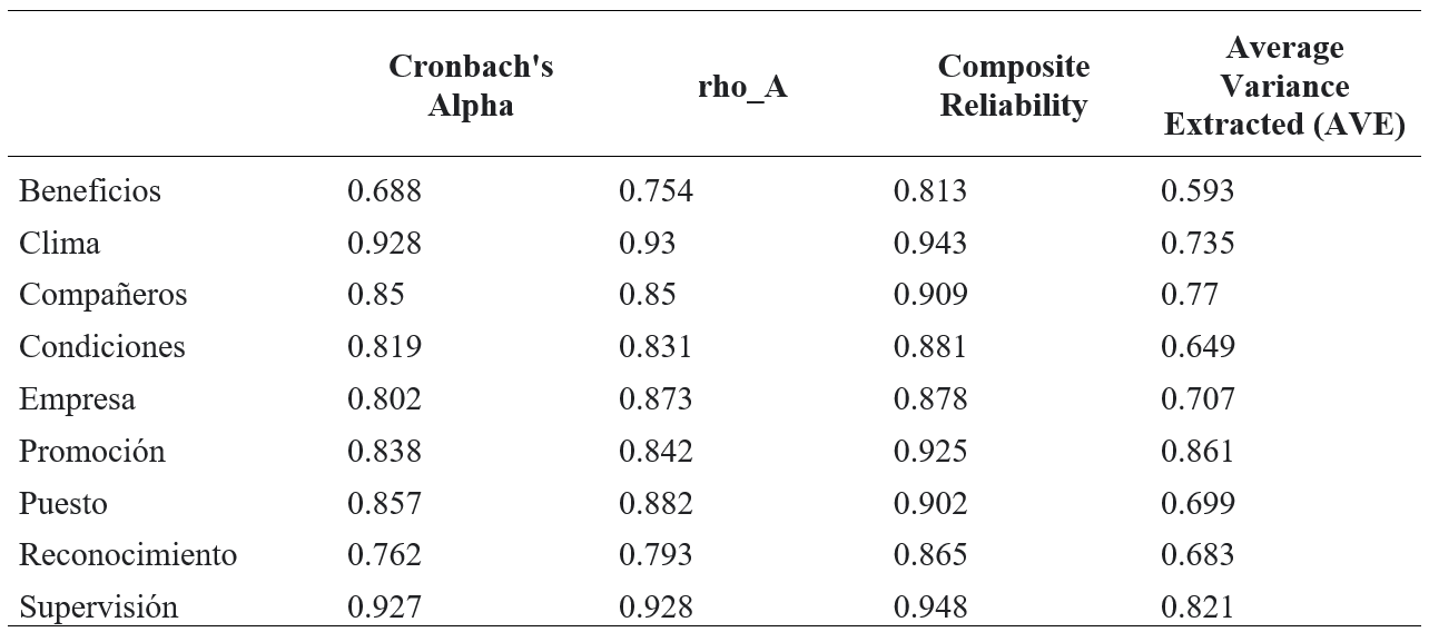 En el Cuadro 1 se muestra los valores de confiabilidad dados por los índices de Alpha de Cronbach y confiabilidad compuesta.