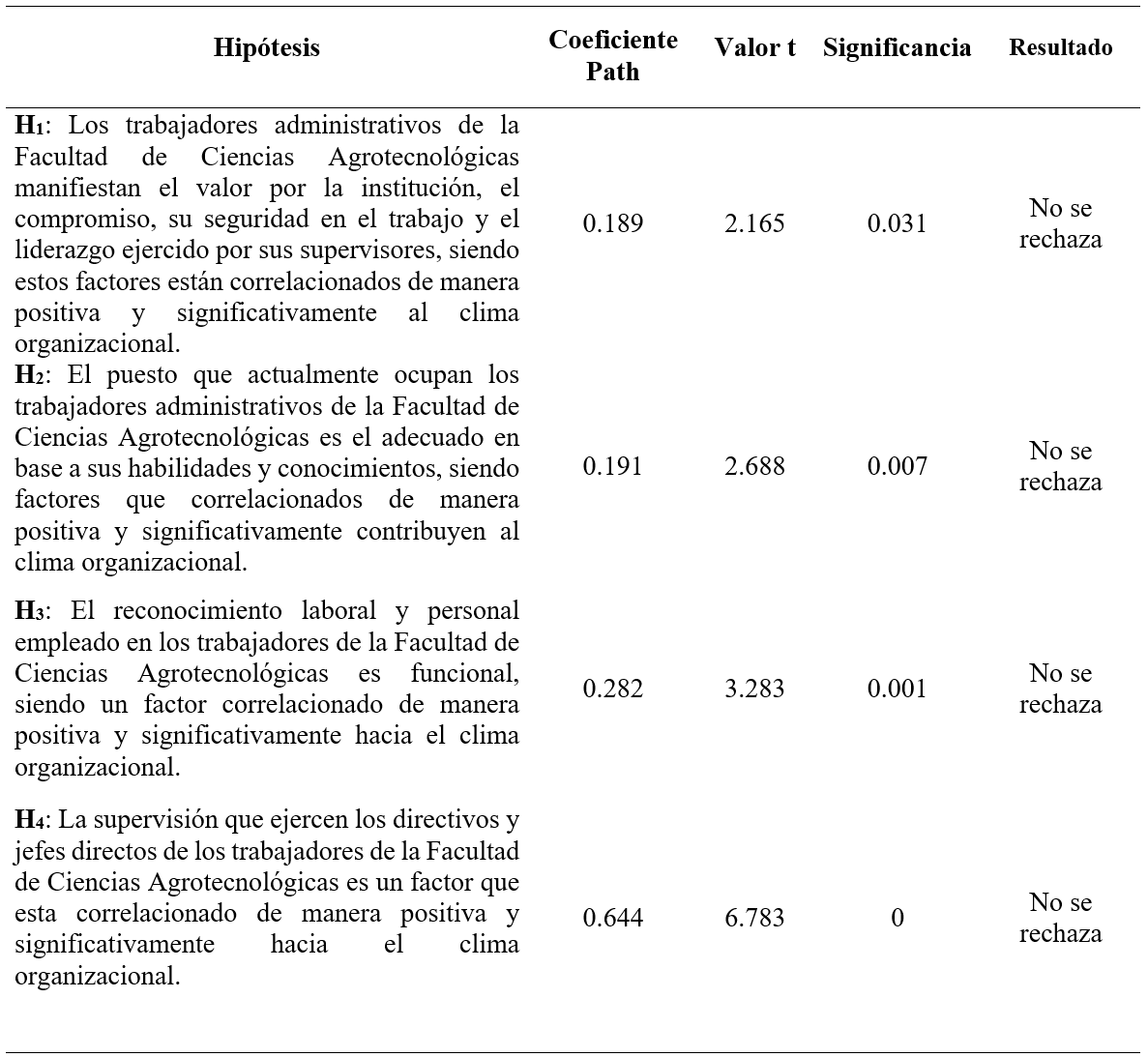La primera hipótesis planteada y la cual no fue rechazada en los resultados de esta investigación trata sobre cómo los trabajadores administrativos manifiestan el valor por la institución, el compromiso, su seguridad en el trabajo y el liderazgo ejercido por sus supervisores, siendo estos factores correlacionados de manera positiva y significativamente al clima organizacional, es decir los trabajadores han demostrado empatía, actúan bajo su misión y visión Institucional esto se atribuye a su sentido de pertenencia y al liderazgo que los encamina hacia al alcance de sus objetivos institucionales y personales, mismos que a su vez les brindan seguridad en su trabajo.