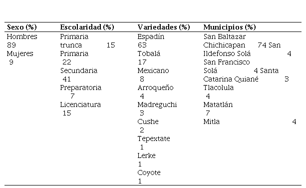 Dentro de la caracterización de los productores existe un alto predominio de hombres en el manejo de las plantaciones agaveras, la formación escolar dominante es la de instrucción primaria, seguida de primaria y primaria trunca, situación que muestra la poca fortaleza dentro de la variable educación. Las variedades que prefieren los productores de agave son en un alto porcentaje dos: Espadín y Tobalá y con relación al número de encuestas que se pudieron capturar fueron en su mayoría las de los municipios San Baltazar Chichipan y Matatlán