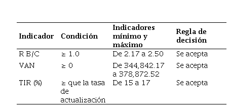 La interpretación de los indicadores de rentabilidad de acuerdo con la metodología de evaluación de proyectos agrícolas y forestales a largo plazo que sirven como orientadores en la toma de decisiones se muestra en el Cuadro 4.