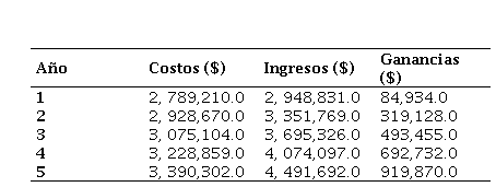 La proyección a 5 años de los costos y los ingresos se muestra en el Cuadro 2.