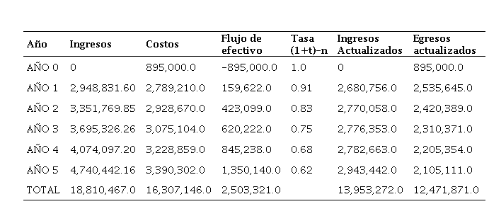 1. Se actualizan los egresos e ingresos por el factor de actualización correspondiente (1+0.1) n, donde n es el tiempo en años (Cuadro 4).