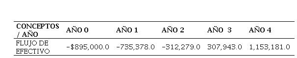 VAN = -$895,000.0 + [ $159,621.0 / (1+0.1)^1 + $423,099.0 / (1+0.1)^2 + $620,222.0 / (1+0.1)^3 + $845,238.0 / (1+0.1)^4 + $1,350,140.0 / (1+0.1)^5 = $1, 481, 401.0