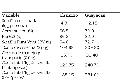 El costo estimado de cosecha fue de $104.65 y $209.30/kg de semilla seca para chamizo y guayacán, respectivamente. El costo de manejo y transporte fue fijo para los dos arbustos (15% adicional del costo de la semilla), siendo este de $15.70 y $31.40 por kilogramo de semilla para chamizo y guayacán, respectivamente. El costo total de la semilla bruta que es la suma resultante de las últimas dos variables fue de $120.35 para chamizo y $240.7 para guayacán. Los resultados finales indican que el costo total de la semilla en base SPV fue de $188.05 y $331.09 para el chamizo y el guayacán, respectivamente.