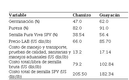 La germinación y pureza de la semilla importada fue diferente entre especies con 47.0 y 82.0%, respectivamente, para chamizo y 62.0 y 91.0%, respectivamente para guayacán (Cuadro 2). El porcentaje de SPV promedió 38.54 y 56.4% para chamizo y guayacán, respectivamente. El precio libre (bordo LAB US dls/lb) fue calculado en función de la INCO TERM 2010 FOB y resultó de $66.0 para el chamizo y $85.7 dólares para guayacán, respectivamente. El costo por concepto de manejo, transporte, pruebas de calidad, sanitarias y manejos aduanales fue de 20% del precio LAB (US dls/lb) y resultó de $13.2 para chamizo y de $17.14 dólares para guayacán.