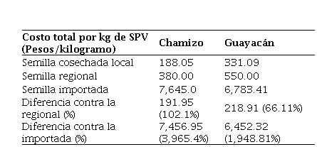 El costo total de la semilla bruta (US dls/lb) que es la suma resultante de las últimas dos variables fue de $79.2 para chamizo y $102.84 dólares para guayacán. Los resultados finales indican que el costo total de la semilla base SPV (US dls/lb) fue de $205.50 y $182.34 para el chamizo y guayacán, respectivamente. El costo total de la semilla base SPV se determinó relacionando el costo en bruto de la semilla por el porcentaje de SPV en cada especie.