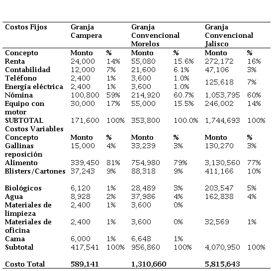En relación con los costos variables, en la granja campera, el rubro de alimento representó el 81%, en comparación con el 77% que significó para la granja convencional, de mayor tamaño, lo cual se manifiesta por la escala productiva que le permite obtener economías de escala; resulta importante señalar que los blisters y cartones, sin ser un costo productivo en sentido estricto, son necesarios considerarlos como costo variable ya que representan el medio para manejar el huevo dentro de la granja antes de su venta; en este sentido, representaron entre el 9 y 10% de los costos variables totales (Cuadro 1).