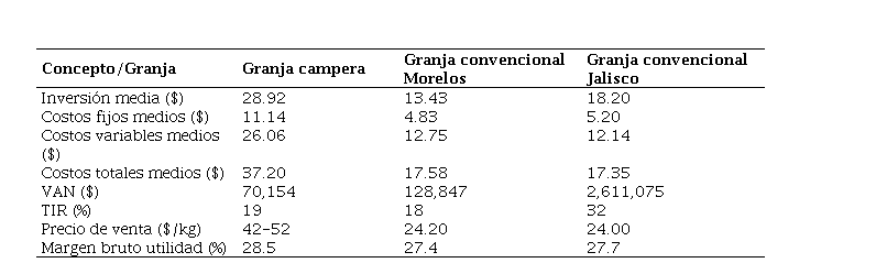 Para la granja campera resultó más elevado producir, ya que los costos totales medios (CTM) fueron de 37.2 $/kg, mientras que para las granjas convencionales éstos fueron de 17.35 $/kg para la del estado de Morelos y de 17.58 $/kg para las del estado de Jalisco, esto es, un 112 y 114% más alto que la primera, respectivamente.