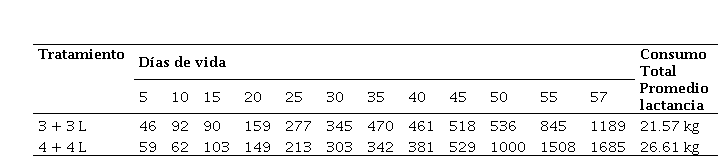 Favela (2015), reporta consumos promedio durante los tres últimos días de 0.691 hasta 0.958 kg en becerros alimentados con sustituto de leche en un período de 45 días de lactancia, estos resultados son inferiores a los observados en el presente estudio. Resultados similares reportan González et al. (2017), en becerros alimentados con 6 L de leche por un período de 50 días, donde los consumos fueron de 1,200 g/d durante los tres últimos días.